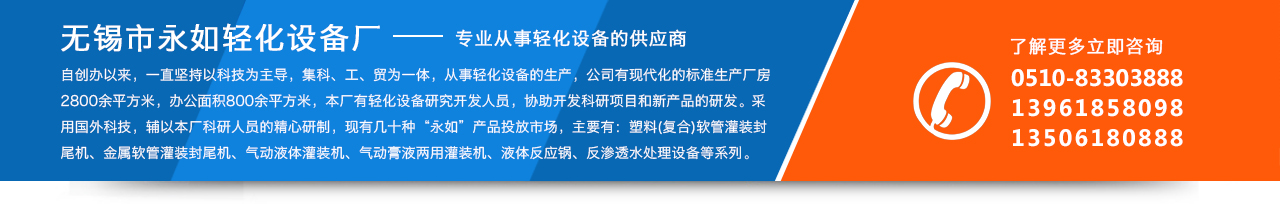 COPYRIGHT © 無錫市永如輕化設備廠 專注生產:封尾機, 灌裝封尾機, 凝膠灌裝機, 全自動灌裝封尾機, 真空均質乳化機, 等產品,歡迎來電咨詢! 商務熱線:13961858098 13506180888 地址:江蘇省無錫市洛社鎮張鎮工業園32號 技術支持: 備案號:蘇ICP備15028522號